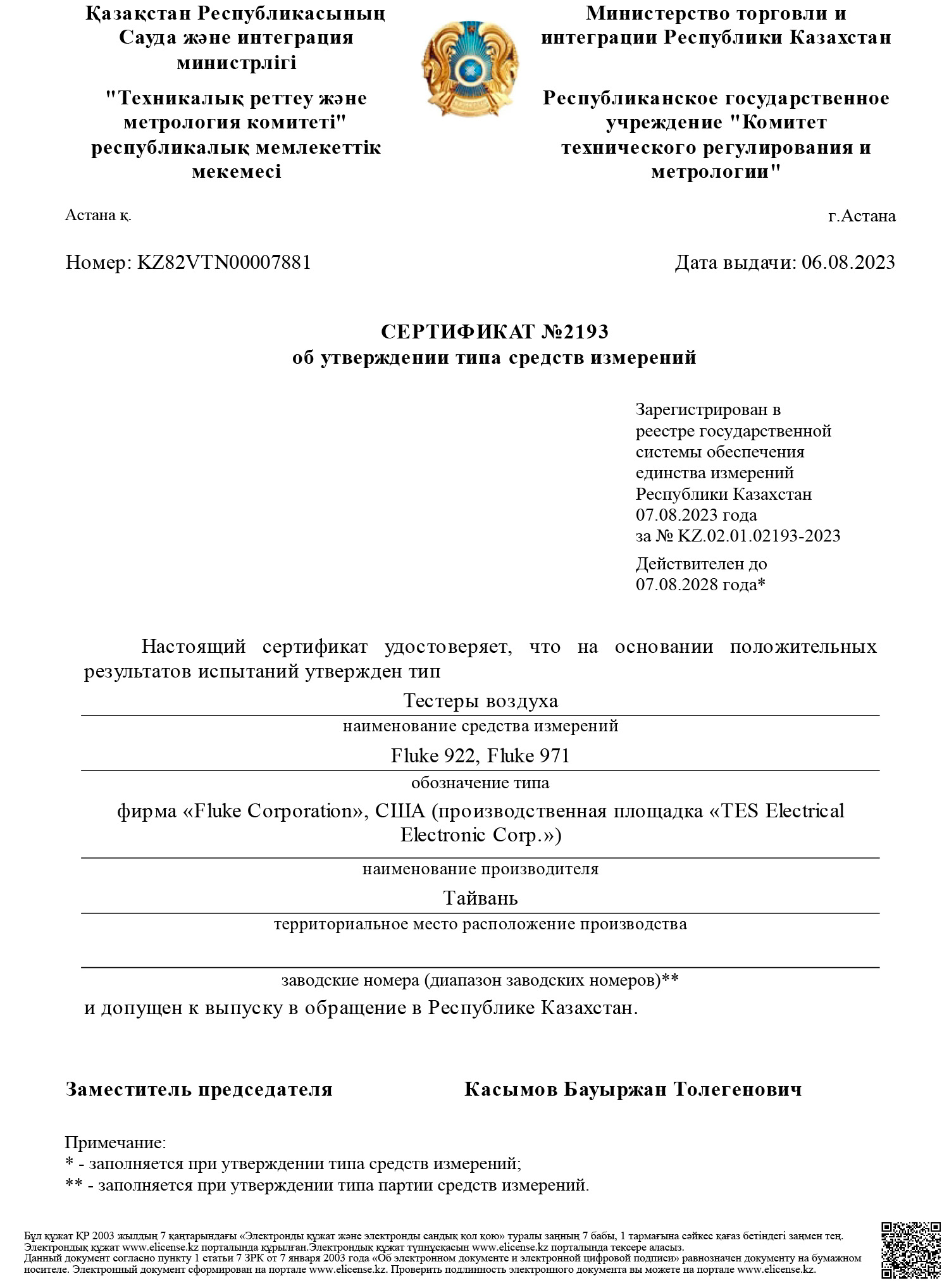 Внесение в реестр СИ РК оборудования: Тестеры воздуха Fluke 922, Fluke 971