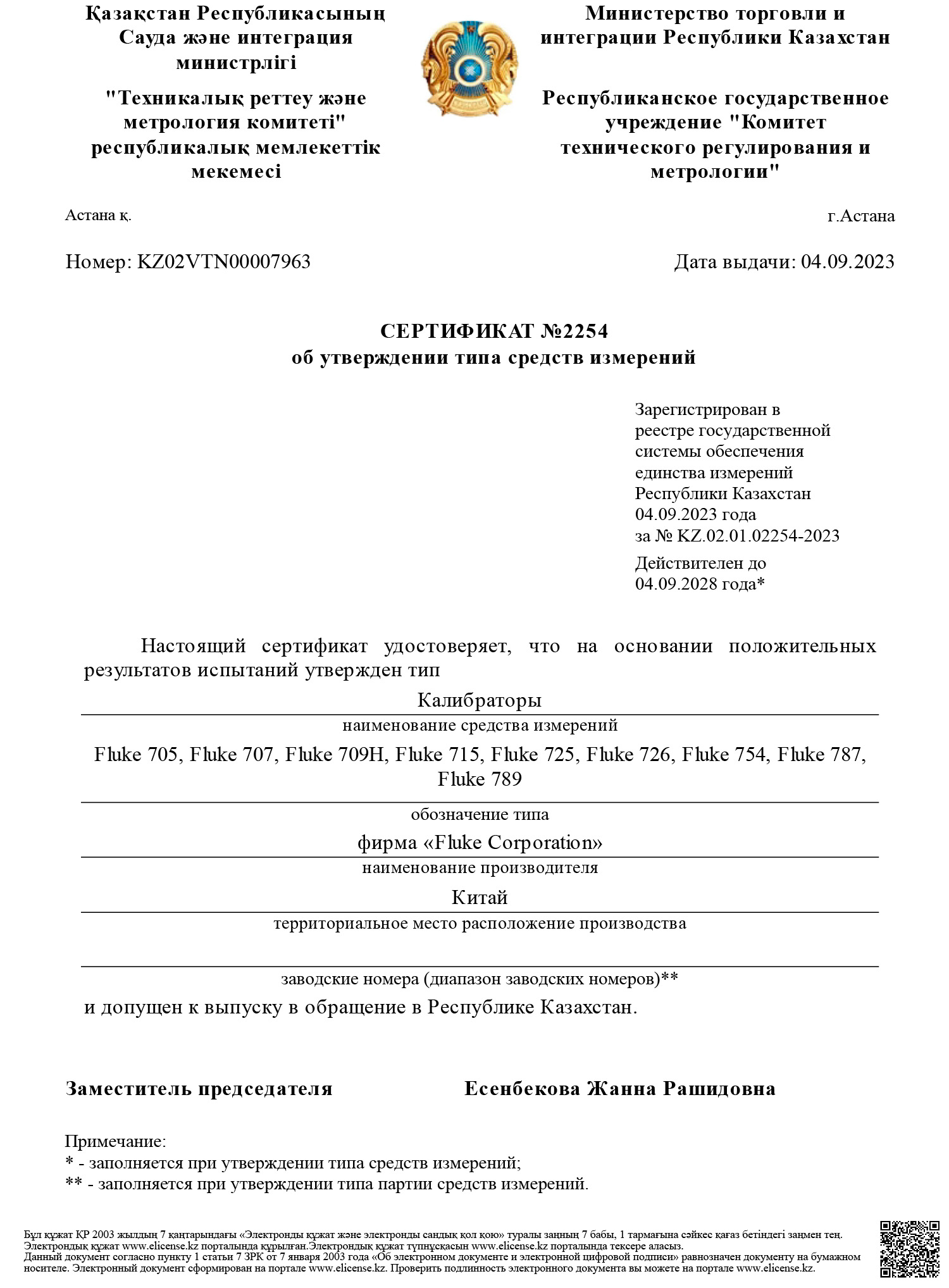 Внесение в реестр СИ РК оборудования: Калибраторы Fluke 705, Fluke 707, Fluke 709H, Fluke 715, Fluke 725, Fluke 726, Fluke 754, Fluke 787, Fluke 789