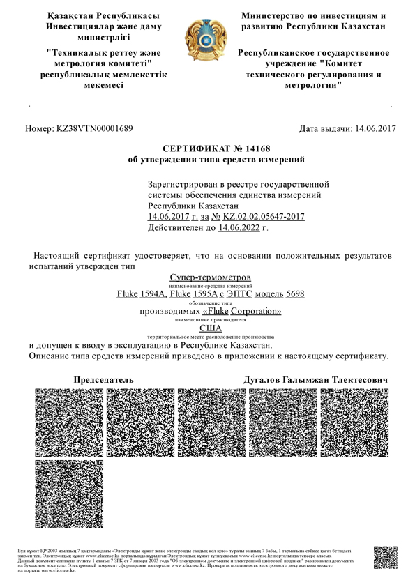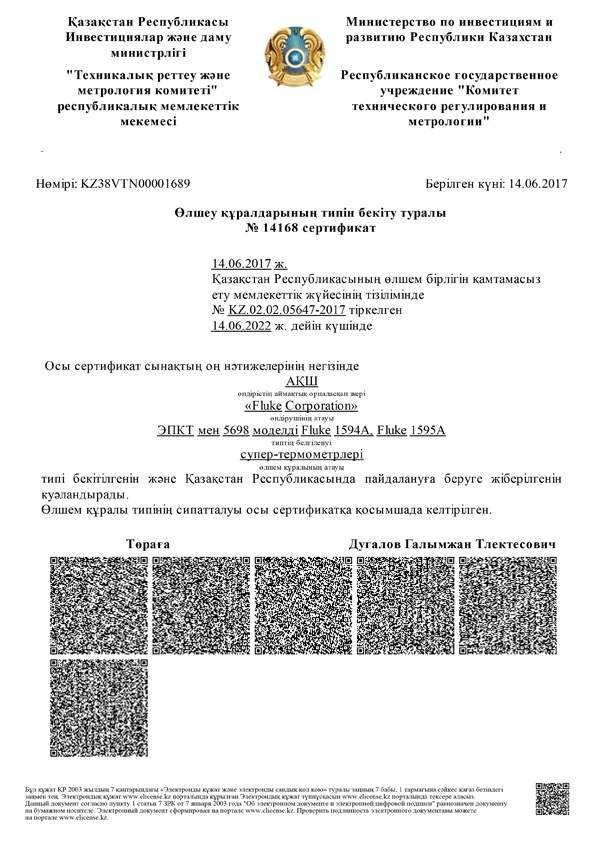 ТОО «ЛинкМастер Казахстан» официальный дистрибьютор фирмы Fluke Corporation, США, на территории Республики Казахстан, рад сообщить о получении сертификата утверждения типа СИ РК на приборы – Супер-термометры Fluke 1594A, Fluke 1595A с ЭПТС модель 5698. Приборы уже приобретены ведущими лабораториями страны. Ждем и Ваших заказов.