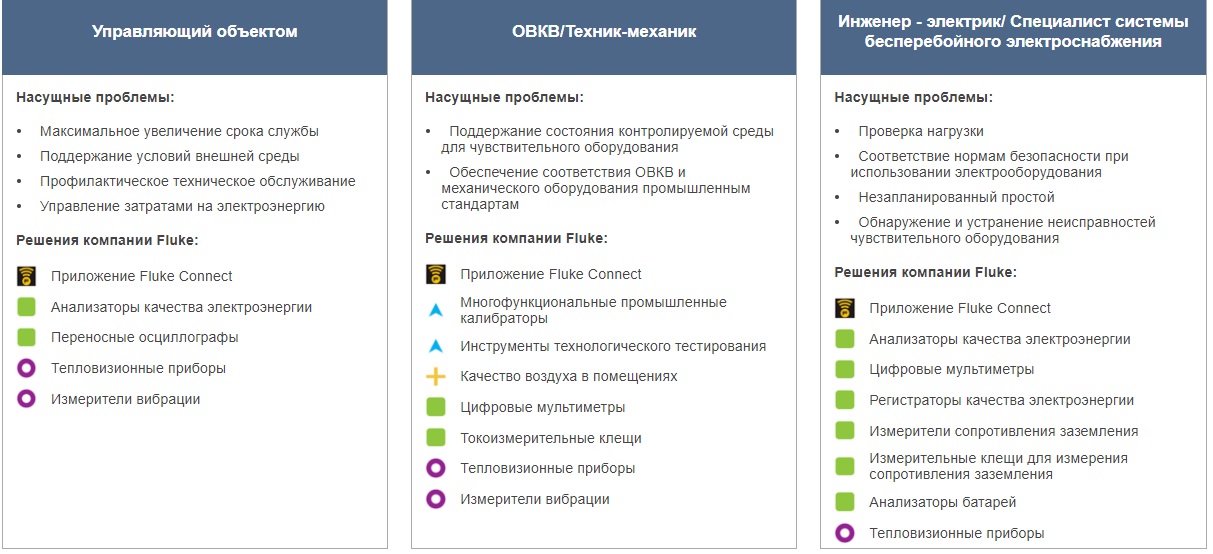 Специалисты центров сбора и обработки данных отвечают за хранение, управление и распространение данных и информации в непрерывном режиме. Это тяжёлая задача в нашем информационно-зависимом обществе, в котором люди рассчитывают на получение необходимой им информации в любой момент. Специалисты, работающие в этой важнейшей сфере, должны иметь возможность полагаться на свой инструментарий, чтобы поддерживать процесс в нормальном рабочем состоянии. Компания Fluke изготавливает полный пакет надёжных высококачественных инструментов для тестирования и проведения измерений, на которые специалисты центров по сбору и обработке информации могут полагаться. Мы понимаем задачи, которые каждый день встают перед этими специалистами. Решения, которые они принимают, основаны на информации, поступающей от их тестирующего оборудования. Они не смогут принимать обоснованные решения, если не будут полагаться на получаемые данные. Они могут быть уверены, что инструменты компании Fluke будут стабильно предоставлять им правильную информацию, чтобы они могли уверенно выполнять свою работу.