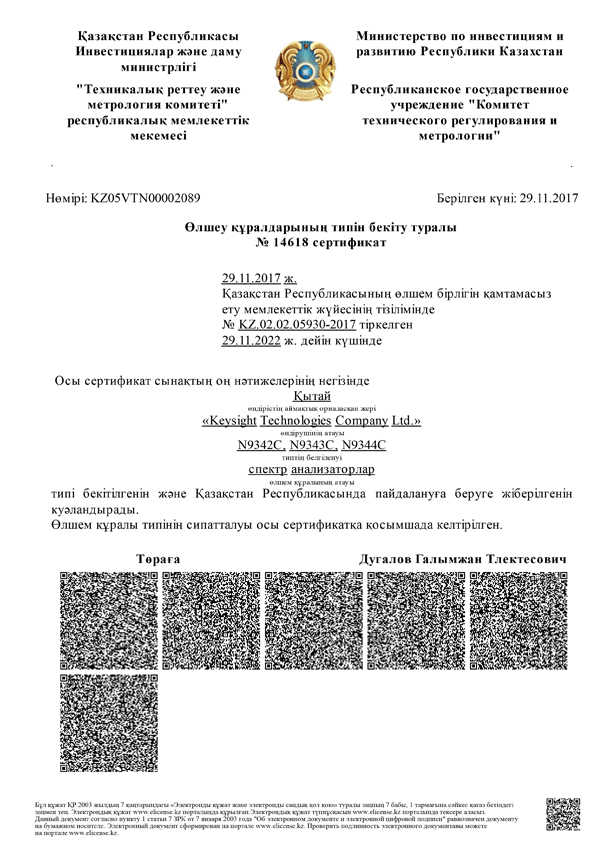 ТОО «ЛинкМастер Казахстан» официальный дистрибьютор фирмы «Keysight Technologies Microwave Products (M) Sdn.Bhd.», Малайзия, на территории Республики Казахстан, рад сообщить о получении сертификата утверждения типа СИ РК на приборы: Анализаторы спектра N9342C, N9343C, N9344C;
