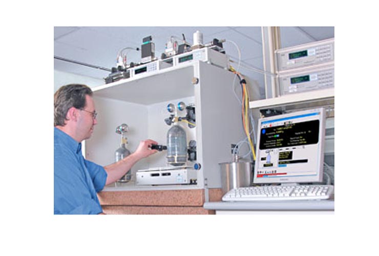Система динамической гравиметрической калибровки массового расхода GFS состоит из электронных весов, корпуса и электронных приборов, необходимых для проведения точных измерений в режиме реального времени массы ушедшего газа, а также времени, в течение которого она работала. Для повышения тепловой устойчивости и смягчения вибраций весы помещаются на большую гранитную плиту и окружаются корпусом для понижения давления. В этой системе эталонный газ подается из баллона под давлением, помещенного на весы, масса которого измеряется непрерывно с целью определения количества и скорости уменьшения массы во время испытания. Время, в течение которого это происходит, измеряется высокоскоростным счетчиком/таймером USB, подключенным к контроллеру системы. В этой системе могут использоваться различные коррозионно-стойкие газообразные вещества – просто путем откачивания эталонного газа из баллона и нагнетания выбранного материала.