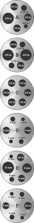 Вставка «F» 9190A, различные метрические отверстия для сравнения с отверстием диаметром 0,25 дюйма |