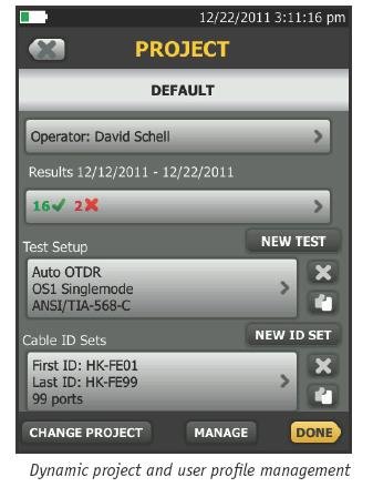 Важным аспектом в максимальномповышении значимости OTDR является правильное планирование егоежедневного использования. Благодаря встроенной функции управленияпроектами OptiFiber Pro позволяет координатору проектов задать роль,настройки и соответствующие задачи для каждого пользователя, преобразуяOTDR в единый инструмент для тестирования волокна с возможностямипланирования, проверки, сертификации и составления отчетов.