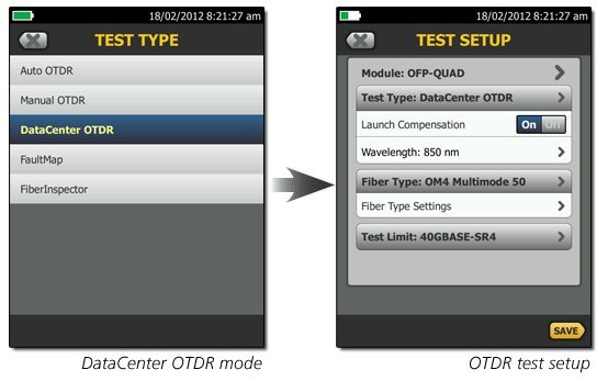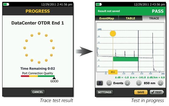 Простым нажатиемпользователь может выбрать режим центра обработки данных для OTDR – бездополнительного времени на точную настройку, которое требуется длясуществующих OTDR. OTDR в режиме центра обработки данных автоматическиопределяет параметры OTDR – алгоритмы определения конца,продолжительность импульсов и т. п. – без путаницы в отношении короткихсоединений или числа соединителей.
