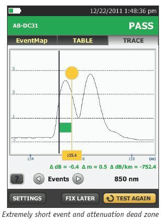 OptiFiberPro максимально эффективно использует самые сложные оптическиетехнологии для обеспечения минимальных мертвых зон событий (стандарт 0,5м для MM) и затухания (стандарт 2,2 м для MM и 3,6 м для SM) для любогоOTDR. Такой технологический прогресс позволяет OptiFiber Proрегистрировать и измерять расположенные рядом неисправности всовременных центрах обработки и хранения данных с множествомсоединителей, чего не могут другие OTDR.