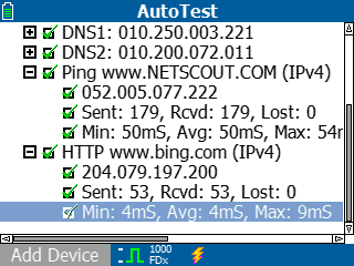 Для проверки подключения LinkRunner AT использует Ping-тест или открытый тест TCP-порта. Выполняется проверка подключения к шлюзу по умолчанию, предпочитаемый DNS-сервер и альтернативный DNS-сервер, включая время отклика. Выполняется проверка с использованием Ping-теста или выбранного пользователем номера TCP-порта подключения к 10 выбранным пользователем целевым устройствам, серверам или услугам. Результаты включают время отклика и IP-адрес, если в качестве цели был использован URL-адрес.