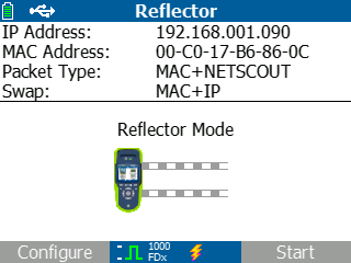 Режим отражателя пакетов прибора LinkRunner AT позволяет использовать его в качестве удаленного устройства во время испытаний на пропускную способность LAN и WAN в сетях со скоростью передачи данных до 1 Гбит/с. Режим отражателя может быть настроен для изменения MAC и/или IP-адреса.