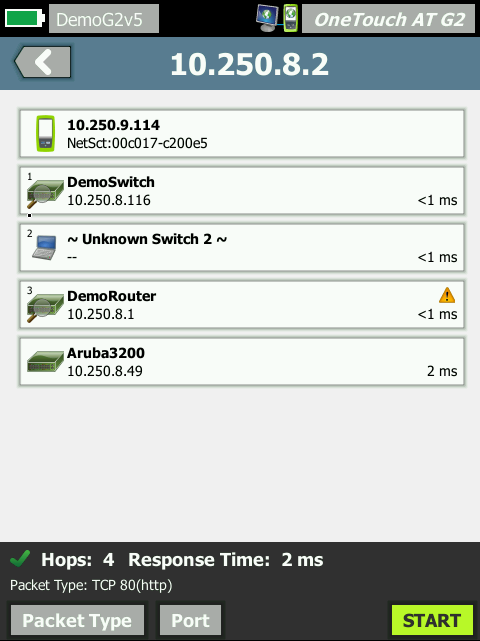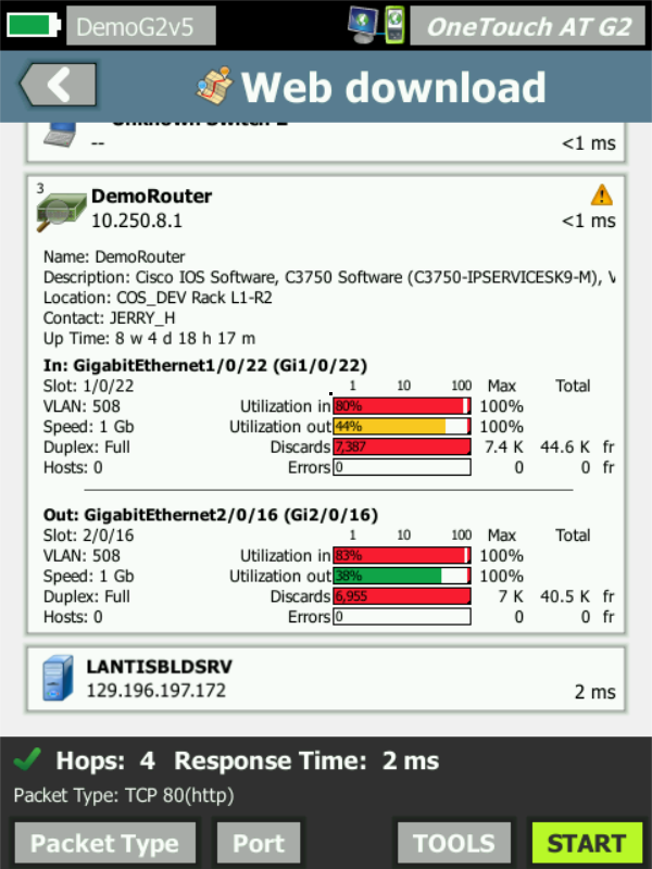 Автоматическое обнаружение устройств, подключенных с помощью медных и оптоволоконных кабелей, а также основные свойства этих устройств. Выберите из девятнадцати вариантов сортировки, чтобы получить различные представления проводной сети. Например, выполните сортировку по адресу IPv4 или IPv6, чтобы определить используемые и доступные адреса. Или выполните сортировку по названию коммутатора/слота/порта, чтобы узнать места подключения устройств в сети. Отсортируйте по выявленным неполадкам, чтобы быстро определить потенциальные проблемы. Дополнительные инструменты анализа посредством обнаружения помогают устранять неисправности и создать профиль. Например, инструмент Multiport Statistics обеспечивает видимость по коммутатору, маршрутизатору и статистику по порту AP, в том числе скорость, дуплекс, слот, порт, VLAN, количество хостов, загруженность, отказы и ошибки. Средство обнаружения устройств на портах Devices on Port обеспечивает просматриваемость устройств на отдельном коммутируемом порте. Инструмент анализа пути обеспечивает уровень 2 и 3 трассировки маршрута от OneTouch AT к целевому устройству, в том числе информацию о времени до одного сетевого сегмента и коммутатора SNMP, а также статистику портов маршрутизатора.