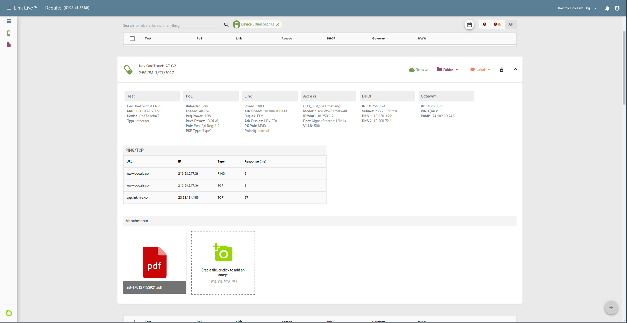 После подключения OneTouch AT к облачной службе Link-Live результаты тестов подключения к проводной и беспроводной сети и отчеты по результатам автотеста автоматически загружаются в информационную панель для управления проектом и создания отчетов. Эта облачная служба доступна когда и где угодно на любом устройстве с браузером и подключением к Интернету. Она особенно полезна для менеджеров удаленных групп, которым требуется мгновенный доступ к результатам тестов. Кроме того, рабочие группы, использующие AirCheck G2, LinkSprinter или LinkRunner, получают единую информационную панель для обработки результатов тестирования сетей, так как все эти портативные тестеры подключаются к облачной службе Link-Live.