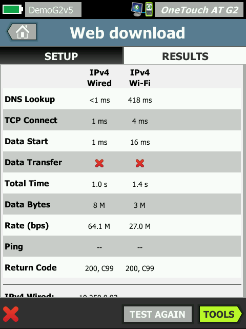 Результаты испытания представляются одновременно для легкого сравнения производительности проводной/беспроводной сети Wi-Fi и протокола IPv4/IPv6. Несколько примеров: пошлите эхо-запрос вашему WLAN-контроллеру, подключитесь к порту 2000 в вашем распорядителе вызовов VoIP, загрузите страницу приложения с веб-интерфейсом, загрузите файл на/с сервера, подпишитесь на многоадресную рассылку, откройте видео с сервера потокового видео по требованию или отправьте электронное сообщение на ваш мобильный телефон.