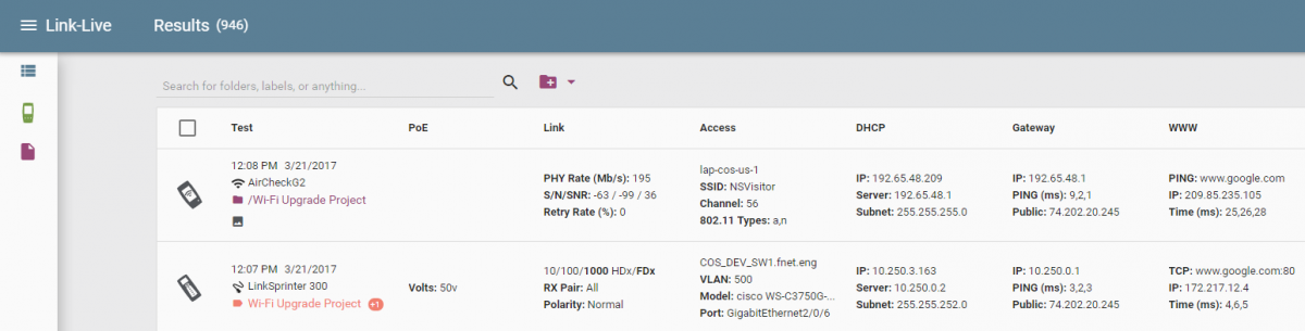 Мы представляем вам облачную службу Link-Live — централизованную панель управления, взаимодействия и архивации для обработки результатов тестирования подключения к сети, переданных портативными сетевыми тестерами NETSCOUT. Результаты автоматически отправляются в защищенную учетную запись в Link-Live, что позволяет вам легко и быстро документировать ресурсы сети, подтверждать производительность, более эффективно управлять работой и эффективностью персонала. Кроме того, уведомление о каждом проведенном испытании отправляется по электронной почте, при этом специалист, проводивший испытание, может добавить свои комментарии и даже прикрепить изображение. Эти комментарии автоматически добавляются к отчету в Link-Live, помогая определить производительность каждого канала и сопоставить изображения конечного оборудования (настенные розетки, устройства, серийные номера) непосредственно со слотом и портом коммутатора.
