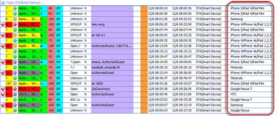 Решение AirMagnet WiFi Analyzer PRO мгновенно обнаруживает и классифицирует смартфоны и планшеты, которые подключаются к сети. Эта возможность позволяет ИТ-профессионалам, разрешить доступ в сеть для этих устройств, быстро найти и устранить проблемы, вызванные этими устройствами, так же как и определить их воздействие на работу и безопасность сети WLAN. Например, пользователь может очень быстро увидеть неавторизованные смарт-устройства, которые подключаются к сети, и определить, является ли использование пропускной полосы конкретным смарт-устройством повышенным, путем просмотра графика «Top Talkers» на приборной панели.