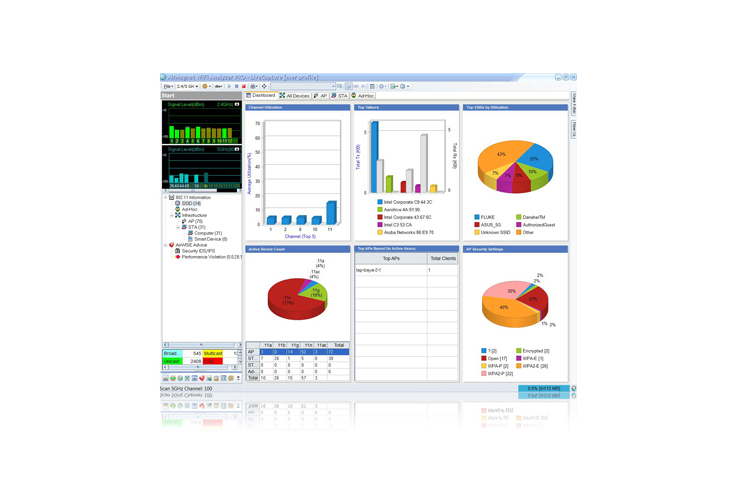 AirMagnet WiFi Analyzer обеспечивает пользователям полную инвентаризацию устройств, включая точки доступа, клиентские и смарт-устройства, работающие в данной среде. Пользователям предоставляется подробная информация о настройках и статистика по трафику каждого устройства. Анализатор WiFi AirMagnet также имеет панель мониторинга, которая предоставляет возможность быстрого обзора работоспособности сети WLAN и помогает пользователям сосредоточиться на основных проблемах, требующих немедленного рассмотрения, с целью обеспечения максимального уровня безопасности и производительности сети. Пользователям предоставлена возможность создания разнообразных диаграмм, в том числе по использованию каналов, наиболее активным (по количеству вызовов) абонентам в сети, уровням помех в беспроводной локальной сети, неправильным конфигурациям, перегруженным точкам доступа, проблемам производительности и т. д. Пользователи могут проводить детализацию для более глубокого исследования статистики беспроводной локальной сети по каждому устройству, каналу и структуре беспроводной связи. Он помогает пользователям сконцентрироваться на том, что для них важно, прежде чем исследовать приложение в поисках расширенного анализа. Это помогает сэкономить массу времени и усилий при поиске и устранении неисправностей в сети.