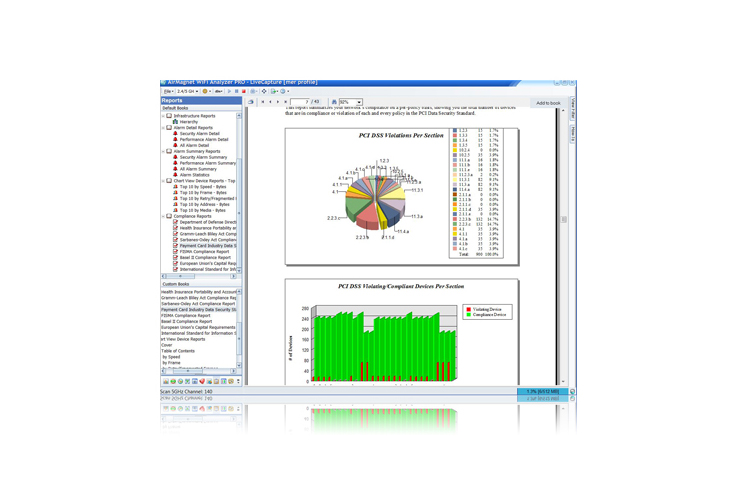 Встроенное средство создания отчетов AirMagnet-WiFi Analyzer PRO облегчает превращение сеансов анализа Wi-Fi в профессиональные настраиваемые отчеты. Выберите из библиотеки предварительно созданных отчетов или создайте целевые отчеты, выбрав определенные элементы в пользовательском интерфейсе. Отчеты охватывают все области управления, включая статистику по радиочастотам, отчеты о каналах, устройствах, проблемах безопасности или производительности сети, а также отчеты о соответствии различным официальным стандартам, готовые к просмотру аудиторами, включая HIPAA, PCI, SOX, DoD 8 100,2, FISMA и многие другие. Что касается отчетов о соответствии, вам предоставляется возможность поэтапной оценки ’pass/fail’ по каждому разделу стандарта вместе с подробной информацией об устройствах, которые им соответствуют илине соответствуют.