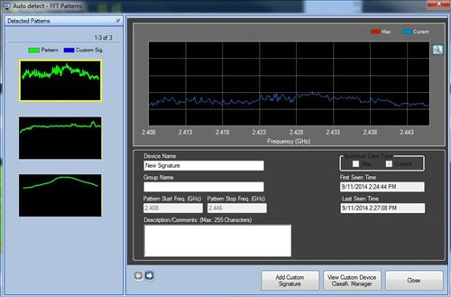 Для того чтобы преодолеть эту трудность и обеспечить пользователям реакцию на источник РЧ помех в тот же день, AirMagnet Spectrum XT представляет первую автоматизированную функциональную возможность анализа спектра в индустрии, которая контролирует радиочастотную окружающую среду, производя поиск уникальных и повторяющихся РЧ шаблонов от этих «неизвестных источников РЧ помех». Как только интересующий нас шаблон обнаружен и классифицирован, потребители имеют возможность создать настраиваемую сигнатуру для этого шаблона для будущих оповещений. С этой возможностью, потребители не только приобретают независимость от периодических обновлений классификаций поставщика, но также имеют более быструю реакцию на устранение проблем производительности их сети.