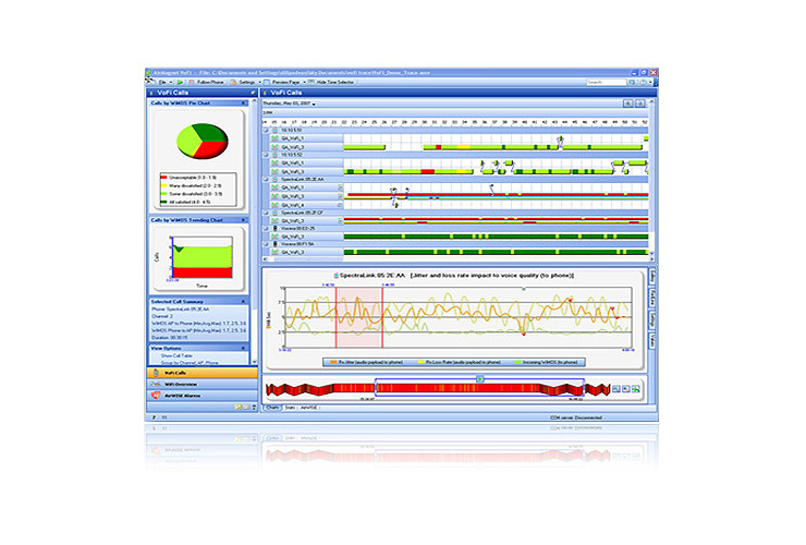 Анализатор AirMagnet VoFi Analyzer представляет сеть с точки зрения вызовов и их качества. Технология прибора AirMagnet, патентная заявка на которую находится на стадии рассмотрения, сканирует все устройства 802.11a/b/g, определяет различия между трафиком голосовых и остальных данных, а также автоматически оценивает качество каждого вызова в форме значений WiR и оценки WiMOS на основе метрик пакетов, например, количества потерь и джиттера. Данное решение независимо оценивает качество и отслеживает обе стороны вызова (точка доступа — телефон и телефон — точка доступа), позволяя пользователям определять проблемы, причина которых кроется в одной из сторон вызова. В соответствии с качеством вызова ему присваивается цветовой код, что позволяет легко отображать проблемные телефоны или вызовы. Данное решение предоставляет полную хронологию всех вызовов в сети и быстро обнаруживает проблемы, связанные с определенным телефоном, каналом или периодом времени.