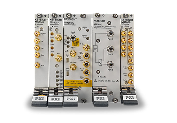 Векторный анализатор сигналов в формате PXIe Keysight M9393A состоит из четырех отдельных модулей: преобразователя с понижением частоты в формате PXIe M9365A, синтезатора в формате PXIe M9308A, дигитайзера M9214A и генератора опорной частоты в формате PXIe M9300A. Модуль генератора опорной частоты M9300A может использоваться одновременно несколькими различными модульными приборами.