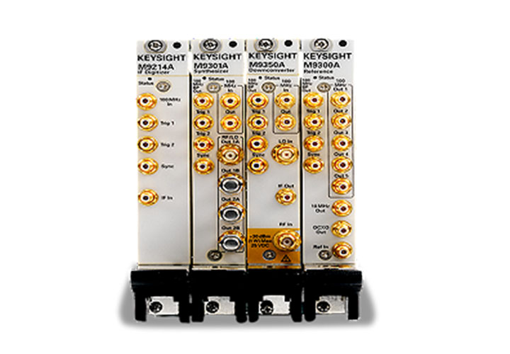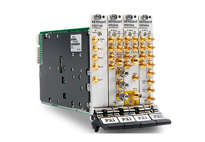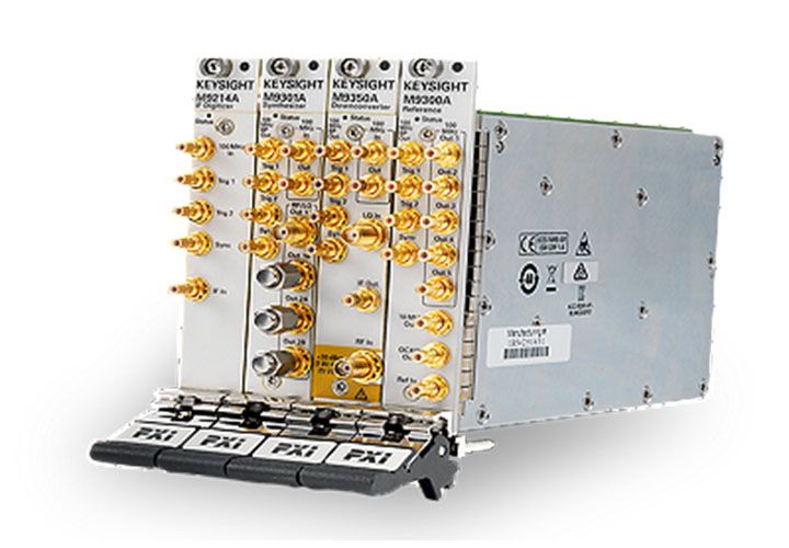 Векторный анализатор сигналов в формате PXIe Keysight M9391A состоит из четырех отдельных модулей: генератора опорной частоты M9300A, синтезатора M9301A, дигитайзера M9214A и преобразователя с понижением частоты M9350A. Он может использоваться совместно с векторным генератором сигналов M9381A, что позволяет получить компактное быстродействующее решение для тестирования ВЧ компонентов.