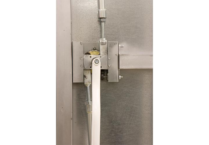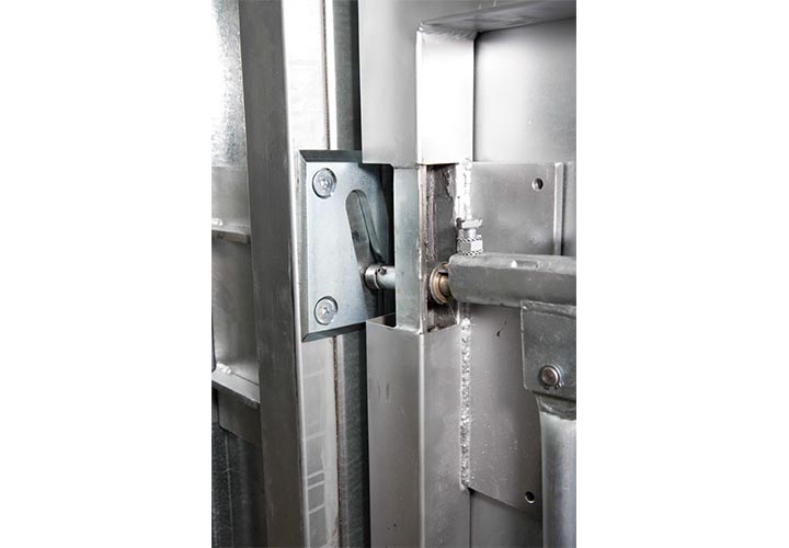 Запатентованные петли дверей на подшипниках обеспечивают легкое круговое движение двери, её регулировку и при заключительной фазе закрытия параллельное совмещение контактных поверхностей двери с контактными группами рамы двери. Это существенно сказывается на эффективности экранирования и сроке эксплуатации двери. Дверь имеет две контактные поверхности и соответственно две группы контактных линий изготовленных из бериллиевой бронзы установленные в раме двери. Привод закрытия двери механический, ручной. Два фиксатора кулачкового типа обеспечивает плотное и надёжное закрытие двери. Внутренняя ручка двери выполнена из прочного радиопрозрачного материала бакелит. Дополнительно возможно оборудовать дверь пневматической системой фазы плотной фиксации и открытия двери, системой разграничения доступа. При заказе возможно выбрать сторону открытия двери и цвет покрытия.