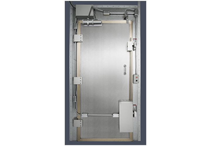 Запатентованные петли дверей на подшипниках обеспечивают легкое круговое движение двери, её регулировку и при заключительной фазе закрытия параллельное совмещение контактных поверхностей двери с контактными группами рамы двери. Это существенно сказывается на эффективности экранирования, надёжности, производительности и сроке эксплуатации двери. В дверь встроен ножевой контакт из латуни и соответственно одна группа контактных линий изготовленных из бериллиевой бронзы установленная в раме двери. Привод закрытия двери от электропривода. Два фиксатора кулачкового типа обеспечивает плотное и надёжное закрытие двери. С внутренней и внешней стороны имеются кнопки открывания дверей. При отключении электропитания для аварийного открывания двери используются механические ручки. Дверь может устанавливаться в сварные и модульные конструкции экранированных камер. При заказе возможно выбрать сторону открытия двери, аварийную сигнализацию, пандус. Автоматика двери может взаимодействовать с различными замками, системами безопасности и разграничения доступа.