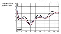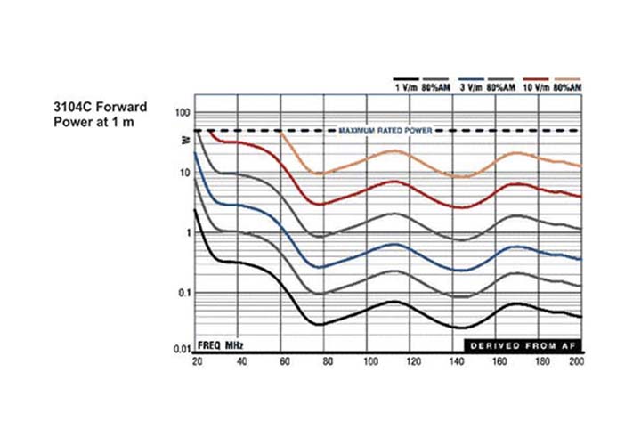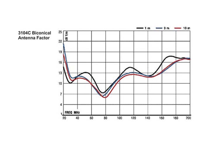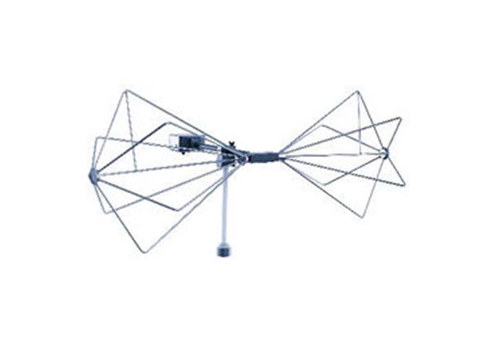 Биконическая антенна с коаксиальным симметрирующим устройством, диапазон рабочих частот 20 МГц – 200 МГц. Среднее усиление сигналов приёма и передачи. Эта антенна может использоваться для измерений помехоустойчивости при условии, что входная мощность ограничена максимумом не более 100 Вт.