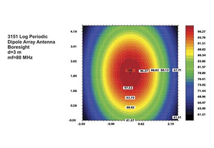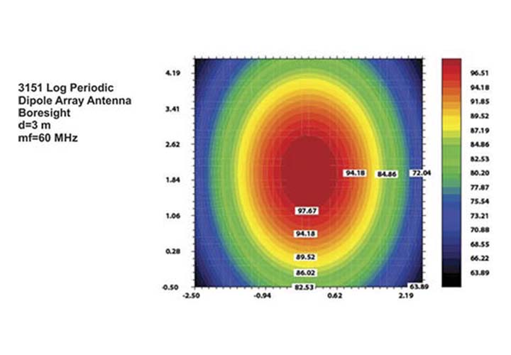 Логопериодическая антенна (LPDA-тип) с рабочим диапазоном частот от 20 Гц до 220 МГц и высокой входной мощностью. Элементы антенны выполнены из коррозионностойкого алюминиевого сплава. Конструкция антенны имеет низкочастотные элементы и установлена на передвижную платформу.