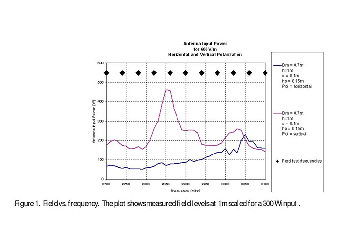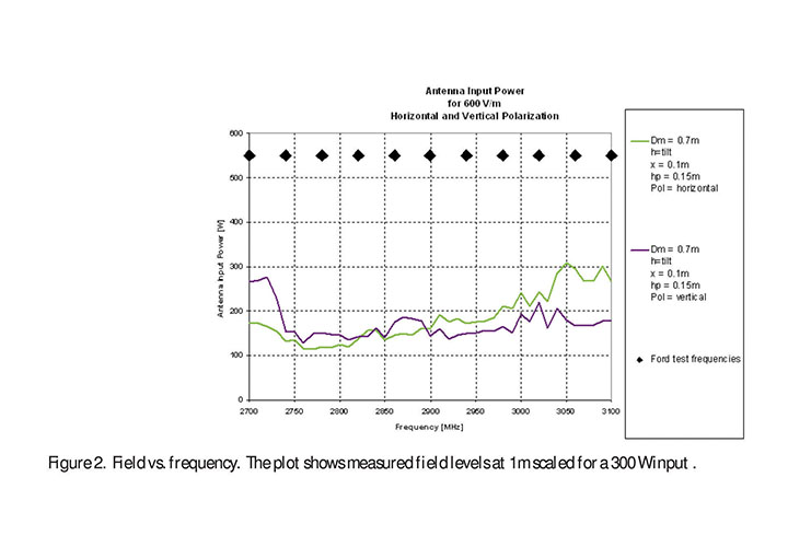 Пирамидальная рупорная антенна, рабочий диапазон частот 2,7 ГГц – 3,1 ГГц. Линейная поляризация, с очень высоким коэффициентом усиления. Генерирует уровень 600 В/м, на дистанции 1 метр, при входной мощности меньше 300 Вт.
