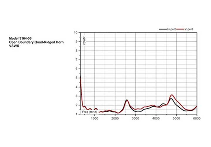 4-х гребневый рупор с открытым излучателем, широкий рабочий диапазон частот 300 МГц – 6 ГГц. Постоянный коэффициент усиления на верхних частотах 2/3 диапазона. Ортогонально расположенные гребни антенны позволяют проводить круговые и линейные поляризационные измерения по всему рабочему диапазону.
